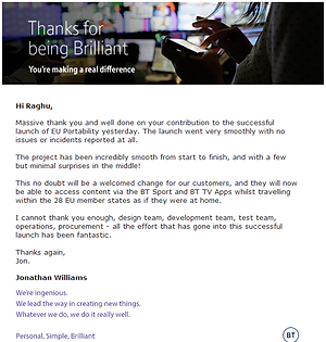 “Hi Raghu, I can say that I am more than fully satisfied with your performance in VF, LeGo. Your contribution was essential and great. HBOGO OTTSE delivery end-to-end. From architecture until delivery